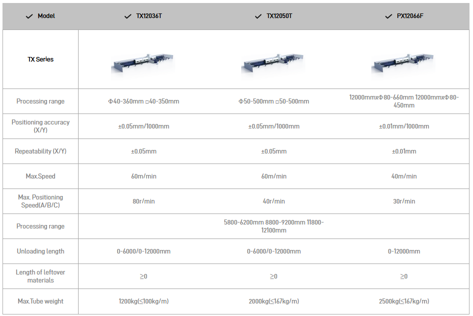 De TX Series is ontwikkeld voor maximale flexibiliteit in buisbewerking. Afhankelijk van het model kunnen buizen met diameters tot 660 mm worden verwerkt en lengtes tot 12 meter worden geladen. Hierdoor is de machine geschikt voor zowel standaard buiswerk als zware constructieprofielen.